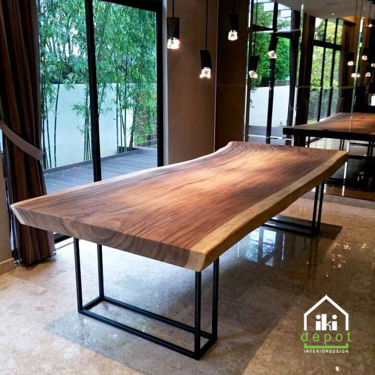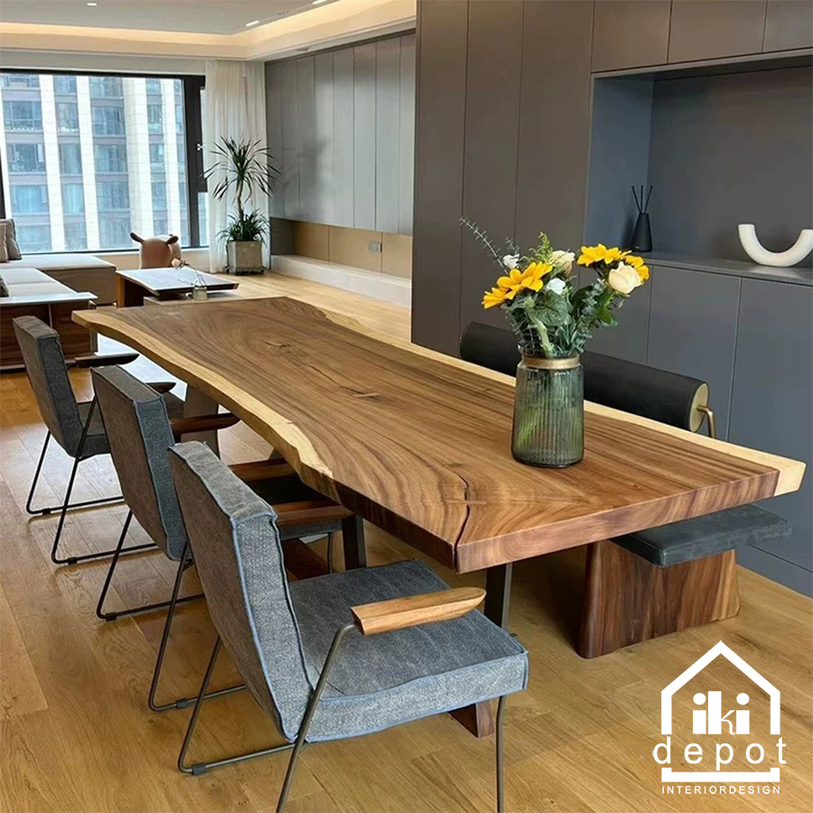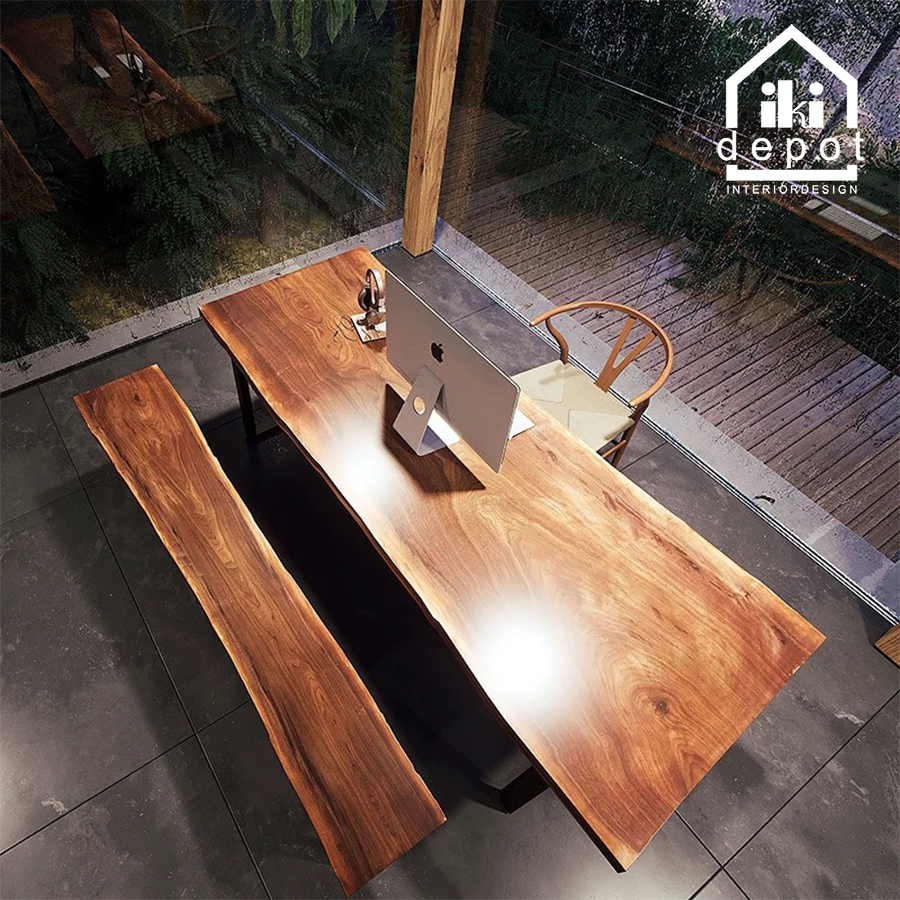 Một trong những điểm đặc biệt của bàn nguyên tấm phong cách Wabi-Sabi chính là sự độc đáo. Không có hai tấm gỗ nào giống nhau, và những vết nứt hay khuyết điểm nhẹ trên bề mặt bàn tạo nên một cái nhìn độc đáo và cá tính. Điều này góp phần thêm sự phóng khoáng và tự do cho không gian nội thất.