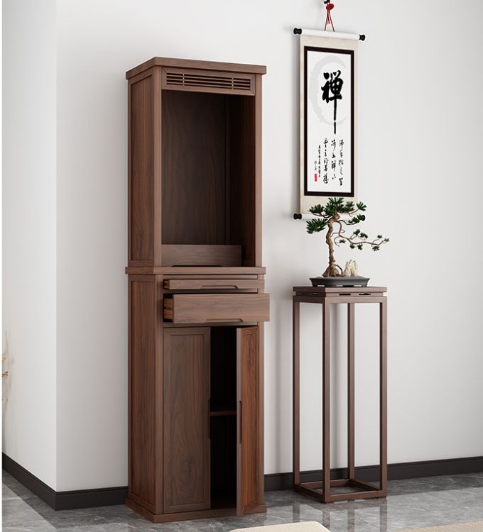 Với dáng đứng gọn gàng, đường nét vuông vức nhưng không cứng nhắc, Tịnh An chắt lọc vẻ đẹp của phong cách tối giản hiện đại và sự trang trọng truyền thống. Cánh tủ kín đáo phía dưới giúp lưu trữ hương nến, vật phẩm thờ cúng gọn gàng. Ngăn kéo và bệ thờ được bố trí hợp lý, thuận tiện cho việc sử dụng hàng ngày mà vẫn đảm bảo tính tôn nghiêm.