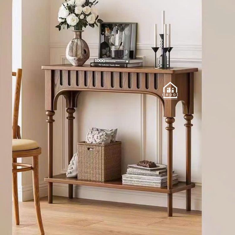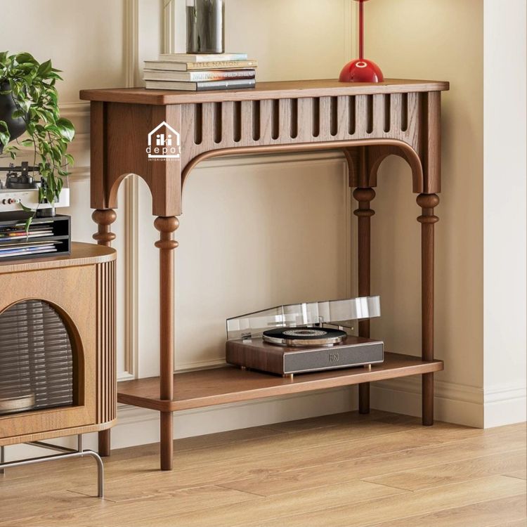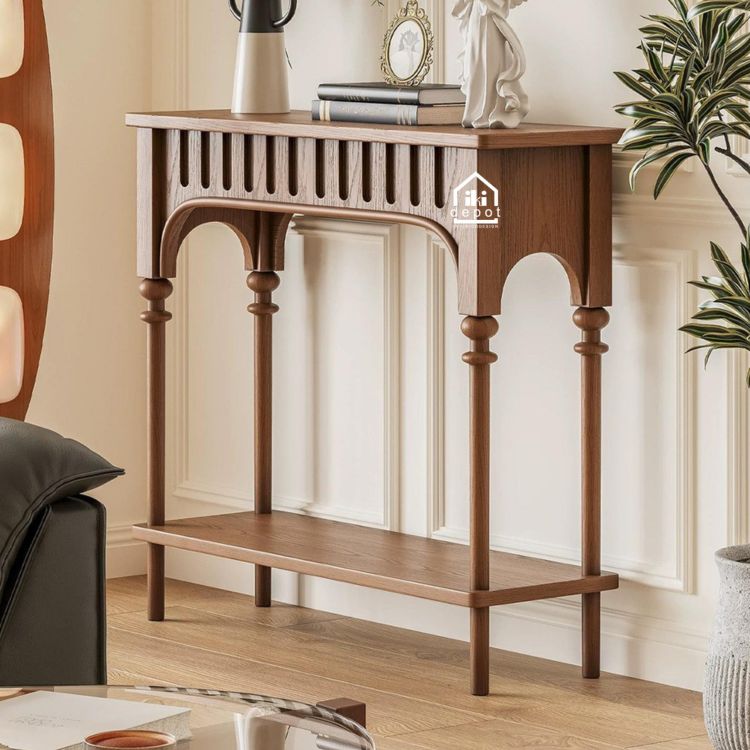 Chân bàn thon, tiện nhẹ. Gờ cong mềm mại giúp tổng thể không bị cứng mà vẫn giữ trật tự hình khối. Đặc biệt, thiết kế tầng kệ dưới mở rộng khả năng ứng dụng – từ đặt decor đến sử dụng thực tế.