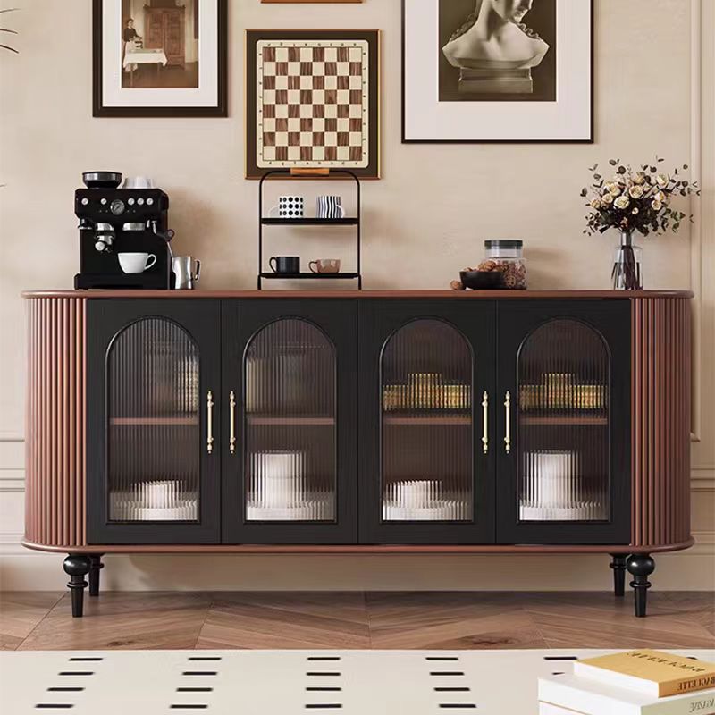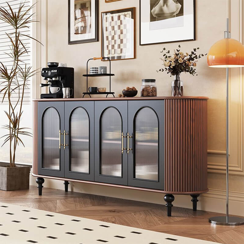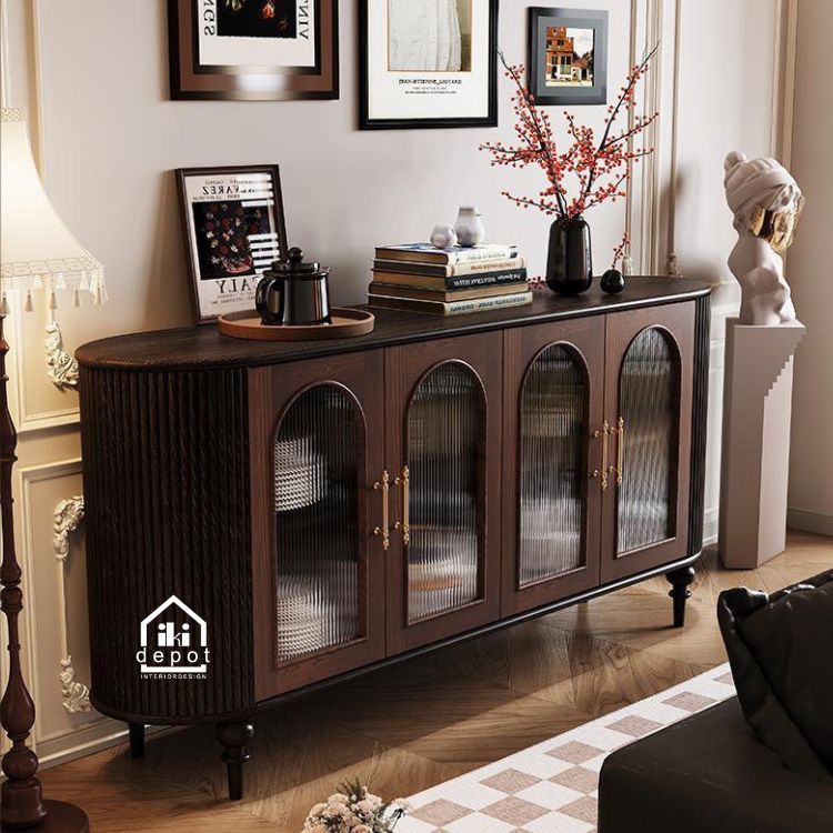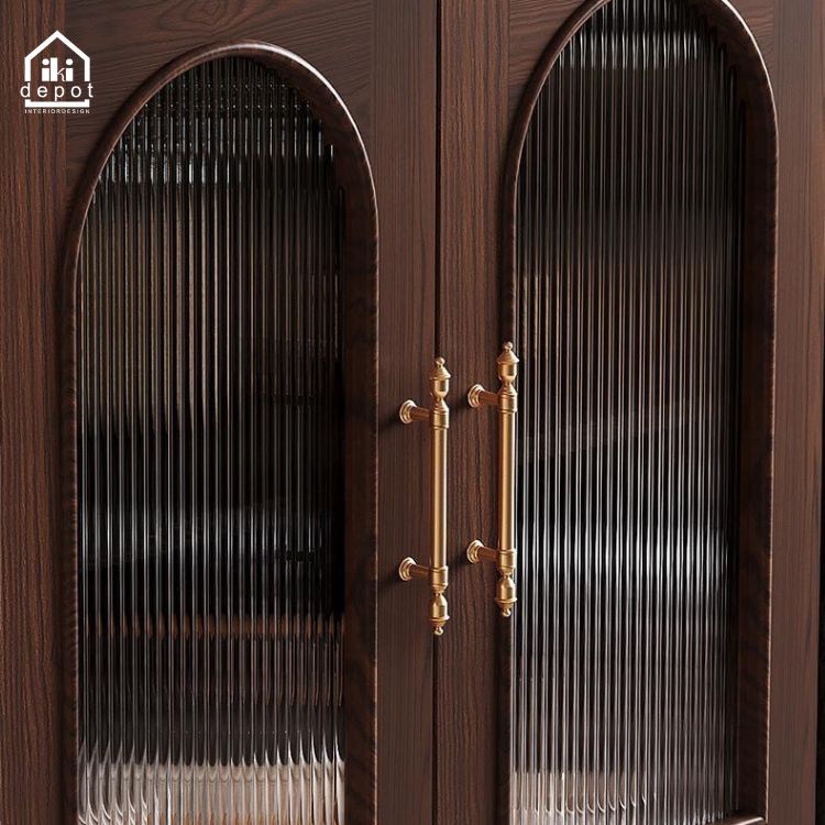 Cánh tủ được tạo hình cong mềm mại – gợi nhớ hình ảnh kiến trúc Pháp cổ với mái vòm duyên dáng, đồng thời thể hiện sự uyển chuyển trong tinh thần Á Đông.